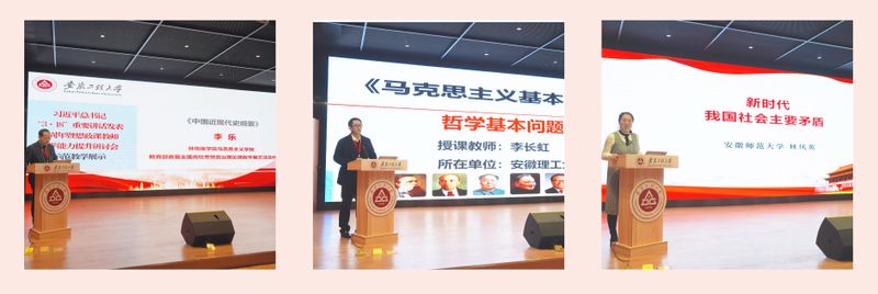 在示范教学展示中,蚌埠医学院马克思主义学院副教授、教育部首届全国高校思想政治理论课教学展示活动特等奖获得者李乐,安徽理工大学马克思主义学院副教授、教育部首届全国高校思想政治理论课教学展示活动一等奖获得者李长虹,安徽师范大学马克思主义学院教师林凤英分别就《中国近现代史纲要》《马克思主义基本原理》《习近平新时代中国特色社会主义思想概论》课程进行了示范教学。