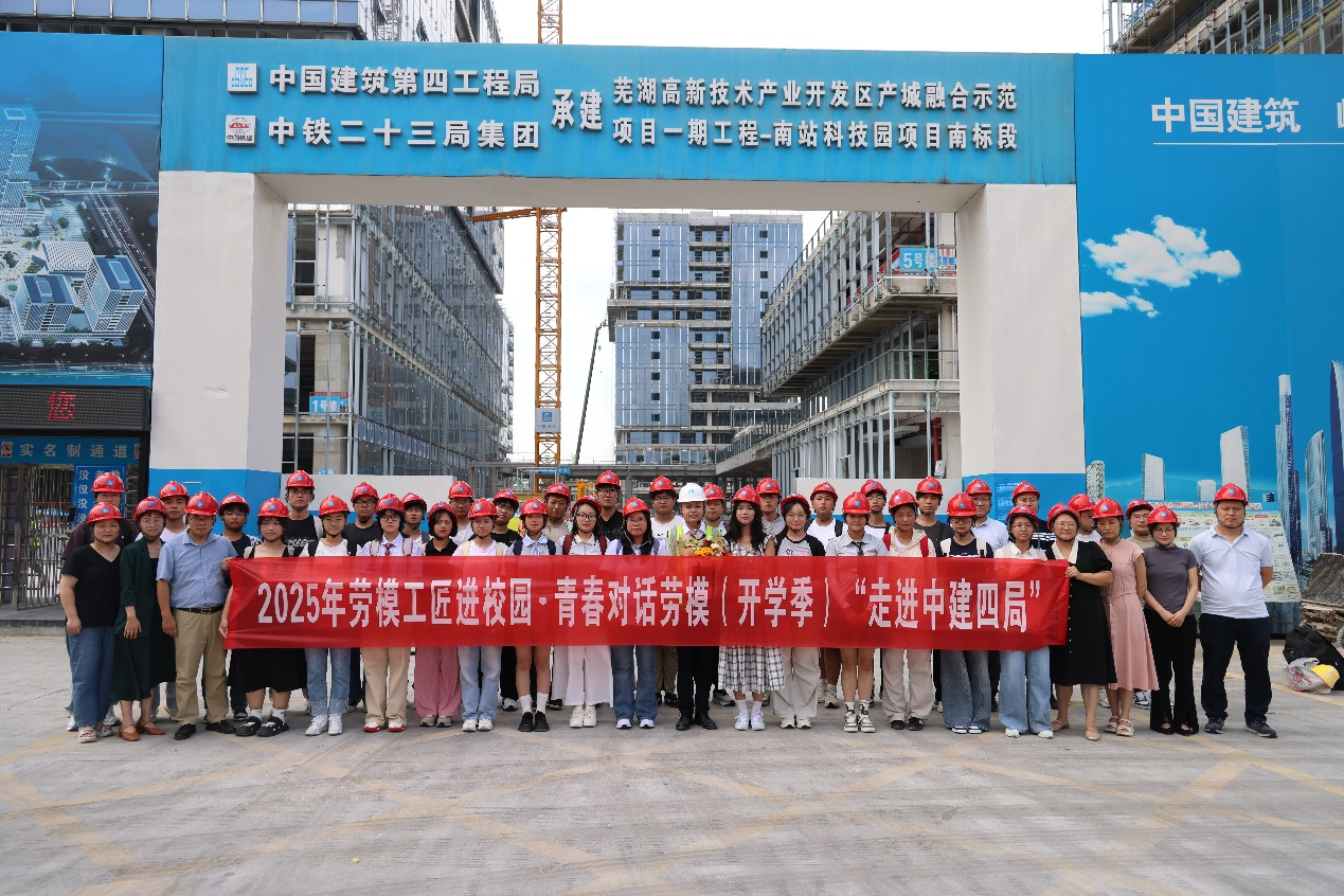 中建四局作为驻芜央企,通过开放项目现场和劳模创新工作室、展示创新成果的方式,为大一新生搭建了认知行业、接触企业的平台。活动伊始,同学们在杨鹏超带领下参观了芜湖南站科技园项目建设现场。作为芜湖市重点工程,该项目以科技创新为核心,展现了现代化工程的精密与高效。在杨鹏超劳模创新工作室,杨鹏超向同学们介绍了创新工作室的工作理念、创新方法,分享了劳模创新团队取得的成绩和荣誉。在杨鹏超劳模专业、详细的讲解中,学生们一边拿起笔记本用心记录,一边近距离接触BIM技术应用、绿色施工工艺等建筑领域技术创新成果,对建筑业转型升级有了更直观的认识。