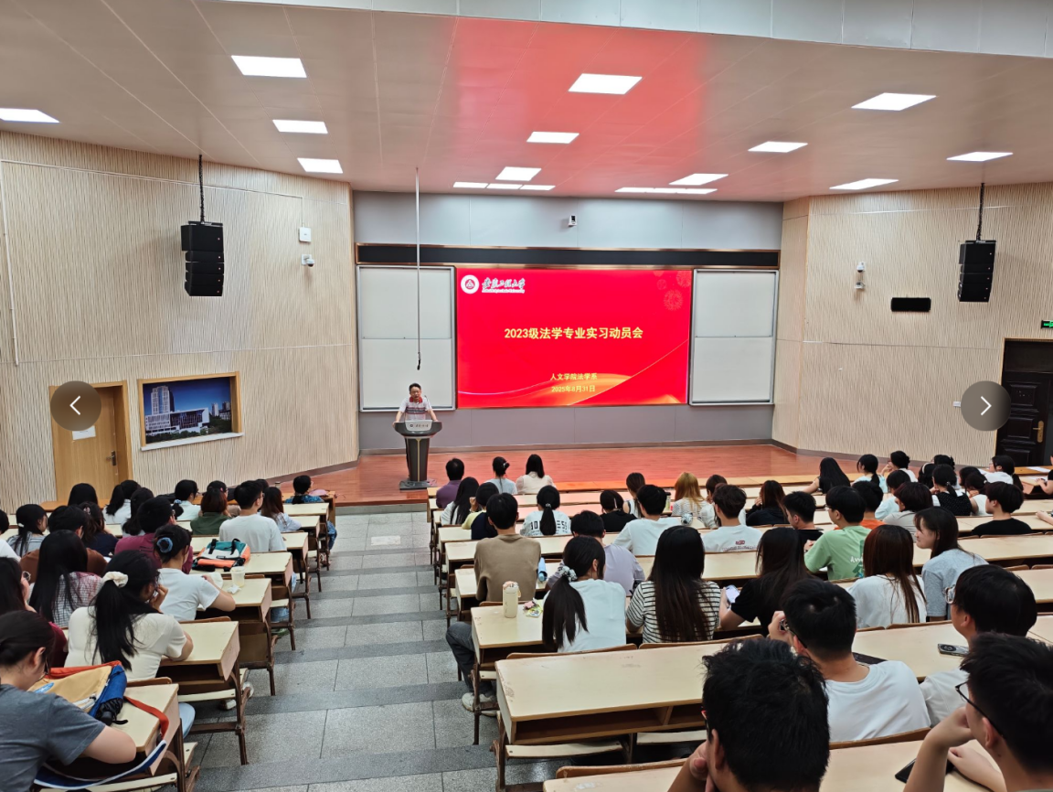 831日晚,人文学院法学系在2教报告厅召开2023级法学专业实习动员会,旨在帮助同学们做好实习准备、衔接理论与实践。2023级全体法学专业学生及系部全体实习指导教师参会,为即将开启的实习阶段明确方向、凝聚共识。