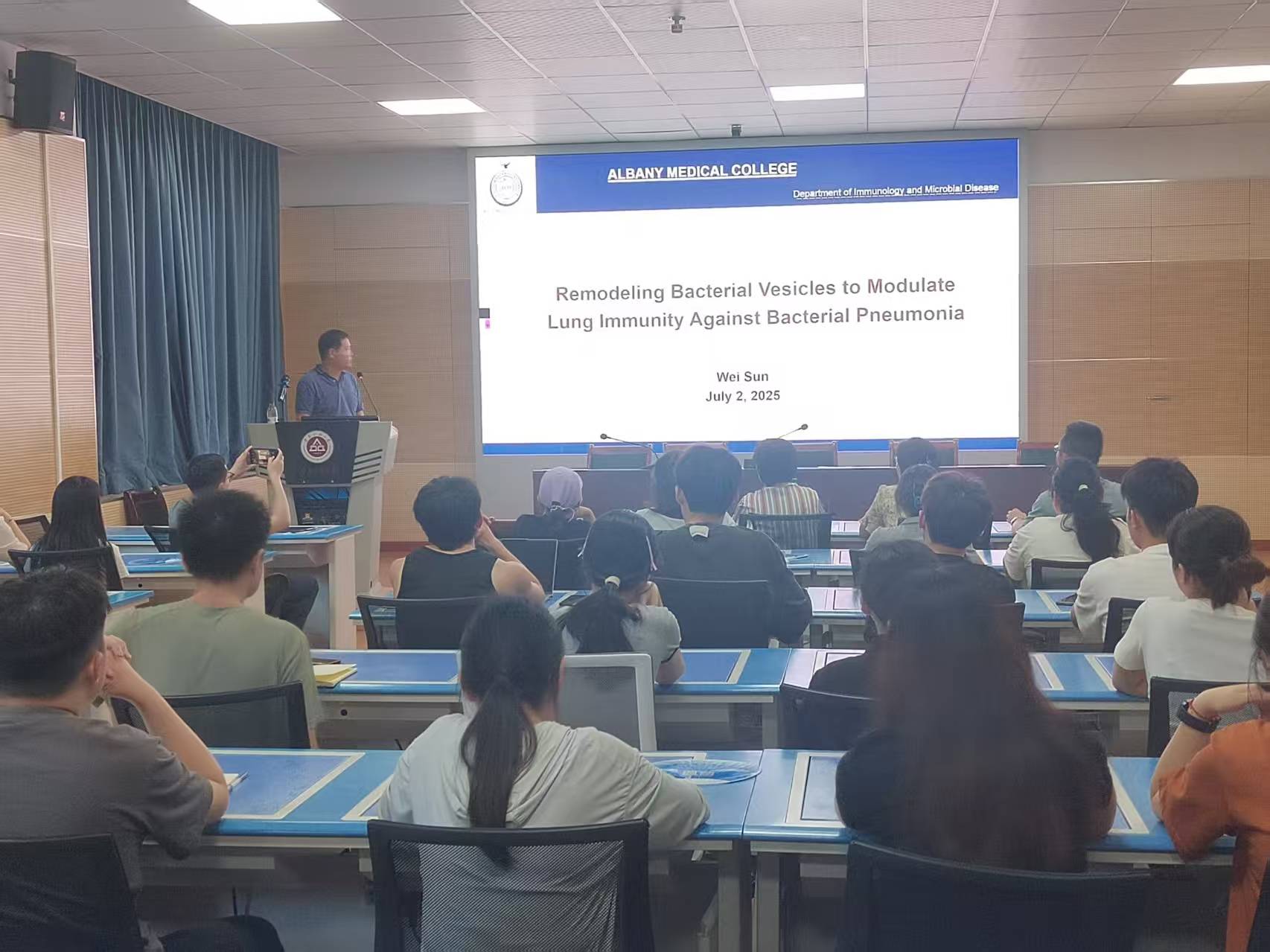 72日,美国奥尔巴尼医学院孙伟教授应邀来生物与食品工程学院作学术报告,并以Remodeling Bacterial Membrane Vesicles to Modulate Host Immunity Against Bacterial Pneumonia为主题,为我院师生带来了一场精彩的学术报告。本次报告会由生物与食品工程学院院长葛飞主持。