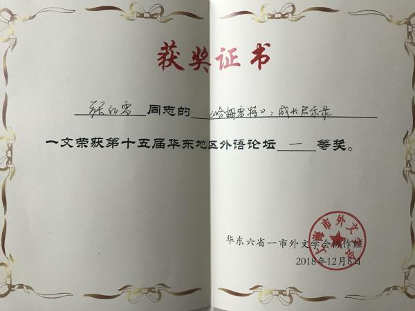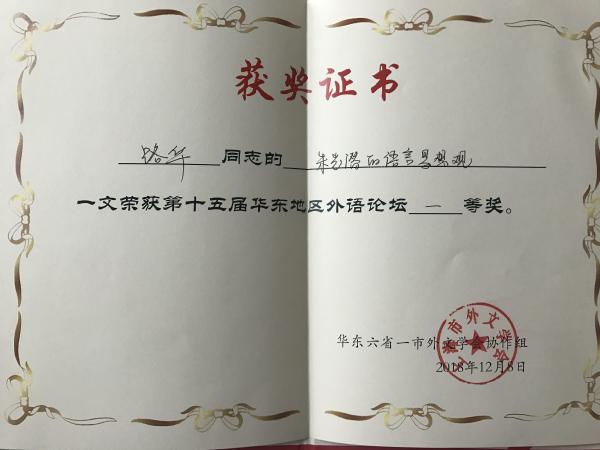 本次论坛同时推出了《华东外语论坛第13辑》,由上海外语教育出版社根据各省外文学会推荐、协作组遴选出优秀论文,汇编成论文集出版。本次大会共收到论文115篇,收录48篇。我校教师路华的论文《朱光潜的语言思想观》和张红雪的论文《<哈姆雷特>:成长启示录》成功入选,并在优秀论文评比中双双获得一等奖。在128日上午的颁奖仪式上,路华作为安徽省获奖老师代表上台领奖,接受荣誉。我校外国语学院的教师连续多年积极参与论坛论文的投稿,并多次入选和获奖,展现了我院教师的学术水平和学术热情。