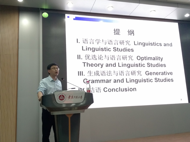 516日晚,安徽师范大学博士生导师张孝荣教授受邀来校进行题为“语言研究中的形式观 (Formal Approaches in Linguistic Studies)”的学术讲座。外国语学院院长黄焰结、部分外语教师及英语专业高年级同学聆听了讲座。