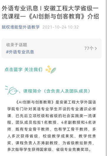 本课程的预期受众为英语专业本科学生。在国家“大众创业、万众创新”的时代背景下,充分结合我校新工科专业办学优势和特色,着力打造“英语+人工智能”的特色,根据党中央及省教育厅关于做好大学生创新创业工作的文件精神,践行我校外国语学院的人才培养理念,针对全院学生开设《AI创新与创客教育》课程,旨在培养德智体美劳全面发展,具有社会责任感、创新精神、创业意识和实践能力的高素质应用型人才。