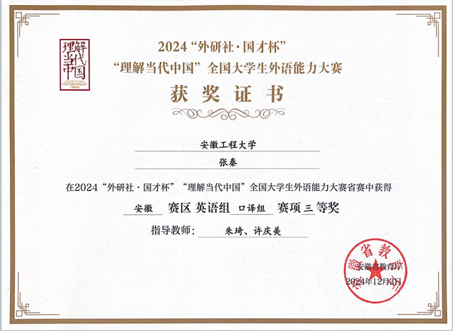 课程始终以赛促学、以战赋能,培育出一批口译能力扎实的优秀学子。学生在全国口译大赛、“理解当代中国”全国大学生外语能力大赛口译赛项、海峡两岸口译大赛等权威赛事中屡创佳绩——多人次晋级华中大区赛、省赛,更有同学在全国口译大赛省赛中脱颖而出,以精湛的语言转换功底与跨文化沟通能力,斩获省赛第一名(“安徽省口译之星”)殊荣。