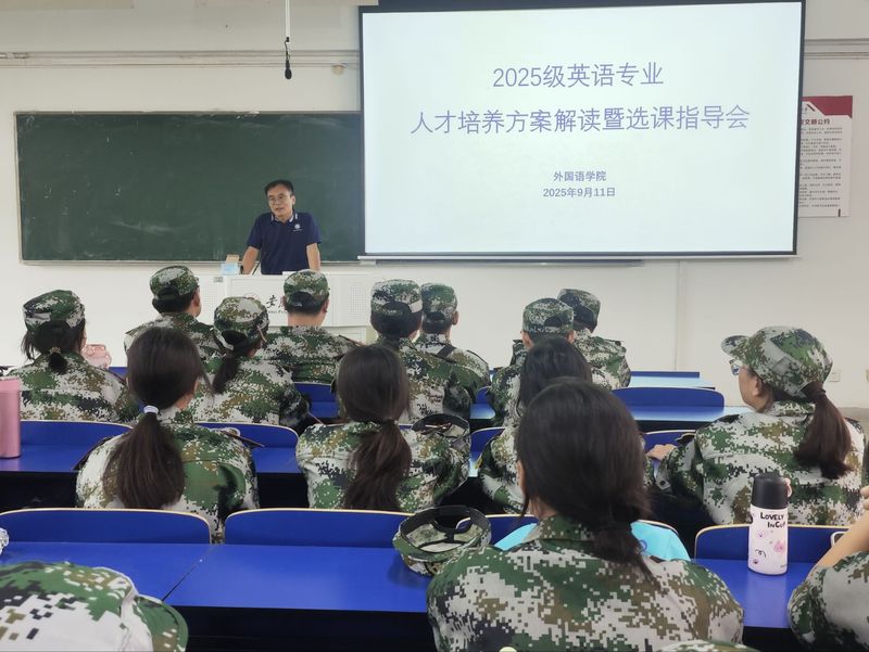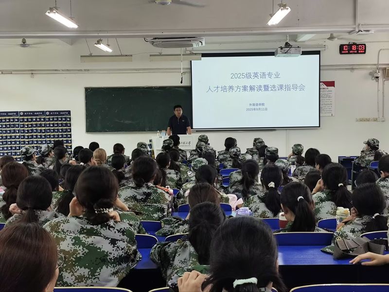 911日上午,外国语学院在6112教室,举办2025级新生专业培养方案宣讲暨选课指导会。学院副院长李新国、英语系主任苏涛担任主讲,2025级英语专业160名新生全部参会。
