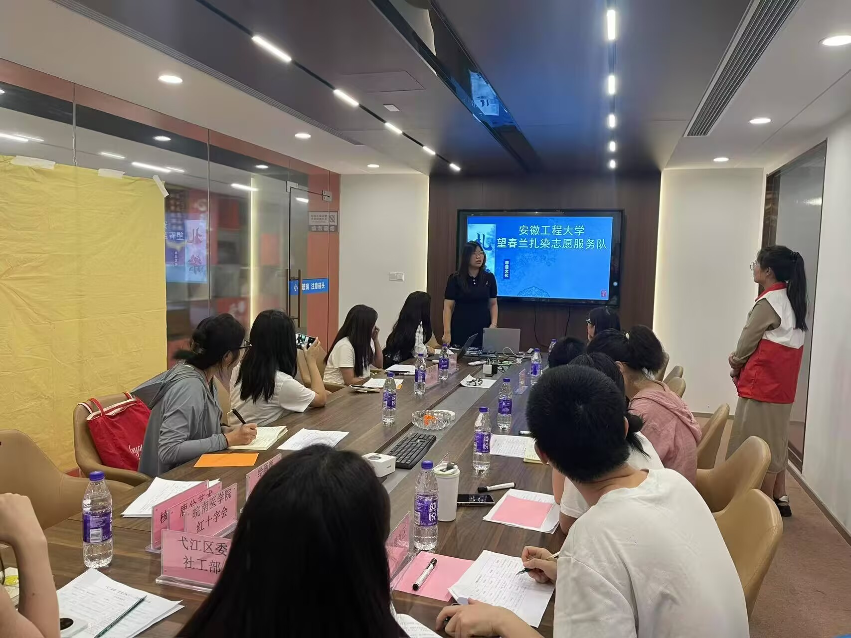 活动伊始,望春兰蓝染实践队负责人前往弋江区委社会工作部,参与由主办方弋江区委社会工作部、承办单位弋江区志愿服务促进中心联合组织的志愿服务对接会议。会上,志愿者负责人详细介绍了望春兰蓝染实践队的成立初衷、团队构成及本次“三下乡”活动的计划与目标,着重阐述了以蓝染非遗为载体开展社区服务的设想;弋江区各社区负责人也依次介绍了辖区内的文化需求、活动场地及居民特点。在随后的意向互投环节中,双方就蓝染技艺进社区的具体形式、时间安排等达成初步共识,为后续志愿服务的顺利开展奠定了坚实基础。