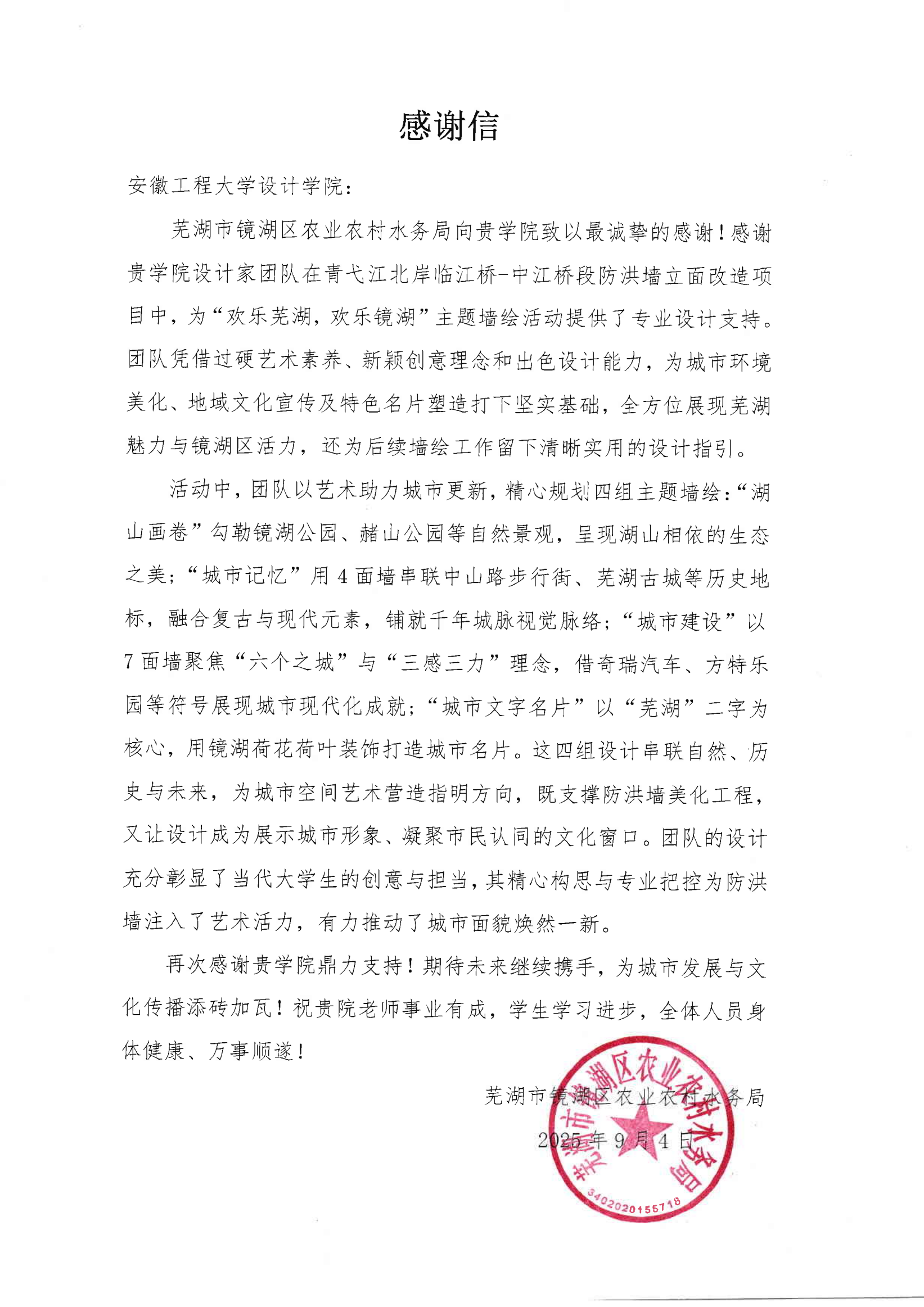 近日,日韩欧美福利视频_黑人巨大人精品欧美三区_欧美成人另类人妖_欧美在线精品一区二区三区_欧美一区二区三区性视频_日韩精品欧美视频_性欧美极品xxxx欧美一区二区设计学院收到芜湖市镜湖区农业农村水务局的感谢信,对学院师生团队在青弋江北岸临江桥-中江桥段立面改造项目中以专业设计助力城市更新、以创意实践彰显青年担当的行动给予高度评价。这封感谢信不仅是对学院教学成果的肯定,更是对学院“专业实践+社会实践”双轮驱动育人模式的生动印证。