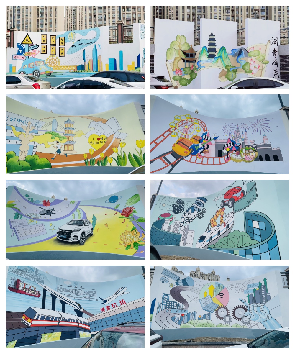 在前期接到镜湖区农业农村水务局以“欢乐芜湖,欢乐镜湖”为主题的墙绘设计委托项目后,设计学院“设计家”师生团队以“艺术赋能城市更新”为核心理念,打造“湖山画卷”“城市记忆”“城市建设”“城市文字名片”四组主题墙绘,将自然、历史与未来融为一体,形成一条可阅读、可体验的城市文化长廊。项目负责人叶宣志表示:“我们希望让防洪墙从‘功能屏障’转变为‘文化窗口’,激发市民对城市的认同感。”